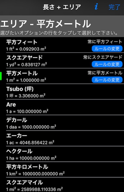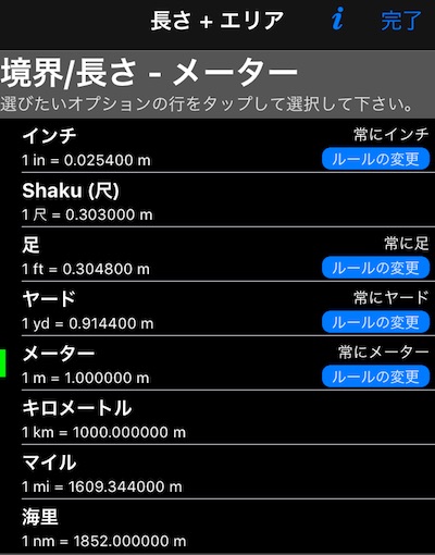 フィートや平方フィート、メートルと平方メートルのようないくつかのユニットでは、ディスプレイが “より大きい"単位のマイルまたは平方マイル、キロメートル、または平方キロメートルに切り替わるときに選択できます。 こうすることで、小さな単位と大きい単位で表現された小さな長さと領域を、より大きな単位で表示することができます。 デフォルトでは、これらのすべてのユニットでこのオプションはオフに設定されています。