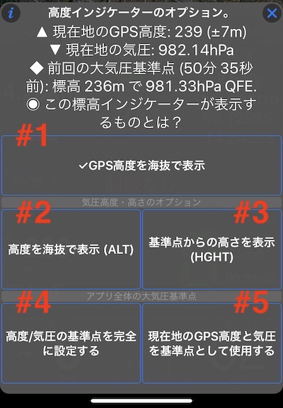 高度インジケーターメニューには、現在のGPS高度と気圧を基準として使用するオプション(#5)、または高度と気圧の間の任意の対応を設定するための「高度/気圧基準設定」オプション(#4)を使用できます。