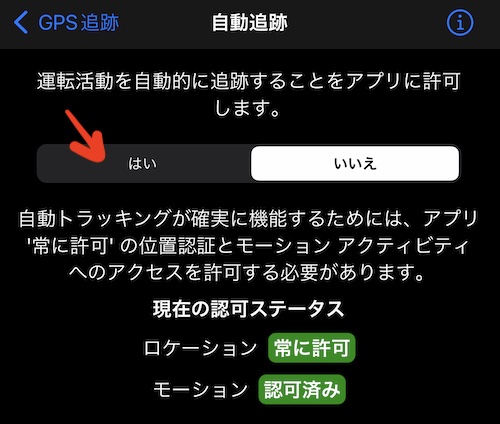 変更された画面を確認し、[はい] をタップして、自動車/運転活動の自動追跡を許可します。