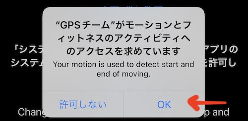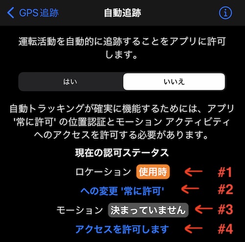 デフォルトでは、最初の起動時に、アプリは「使用中」の位置認証を求めますが、これはそれです。 トラックを自動的に開始および停止できるようにするには、アプリに位置情報へのアクセスと「モーション」へのアクセスを「常に許可」する必要があります。