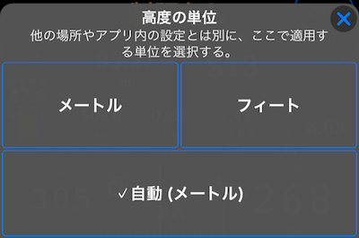 メーターまたはフィートをタップすると、このフィールドが常に固定され、高度が常にメーターまたはフィートに表示されます。 [自動]を選択すると、アプリの設定で設定した値に基づいて、アプリの高度が単位で表示されます。