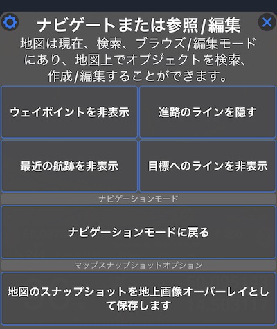 参照モードのマップオプションを表示します。このメニューに表示されるオプションは、アプリごとに異なる場合があります(たとえば、マップスナップショットの保存は、Planimeter 55アプリで使用できる唯一のオプションです)。