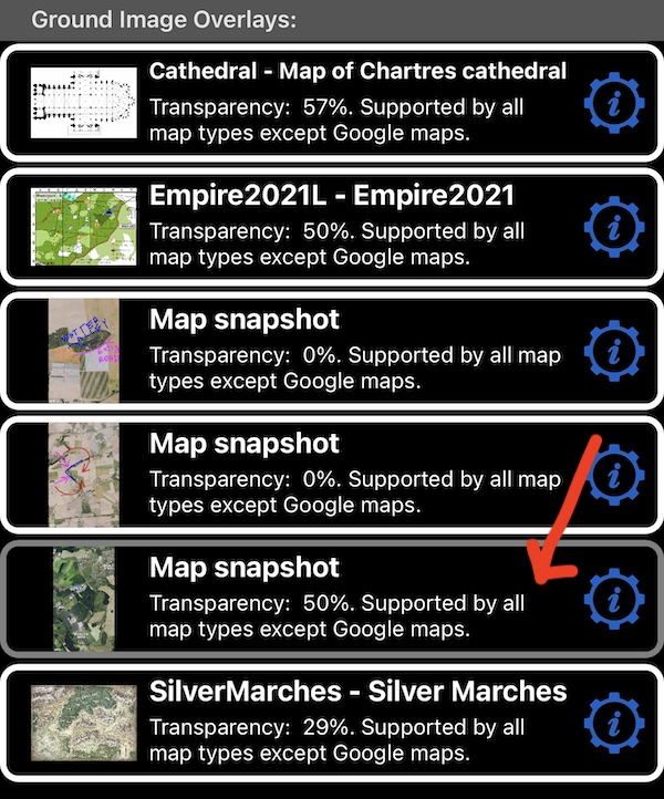 kmzファイルをタップしてアプリで[開く]を選択すると、画像オーバーレイをインポートできます。アプリは、マップリストの[Ground Image Overlay]セクションに画像オーバーレイを追加し、それを有効にして(マップに表示)、デフォルトの透明度50%で割り当てます。