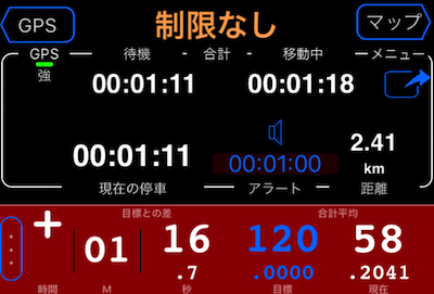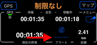 このモードでは、TIMEパネルにアイドル/移動時間モニタが表示され、現在の停止時間アラートを設定できます。 デフォルトでは、アラートは無効になっています。 タイムダッシュ内のALERTラベルの上にある@ “——-“ボタンをタップして、アラート設定を開きます。