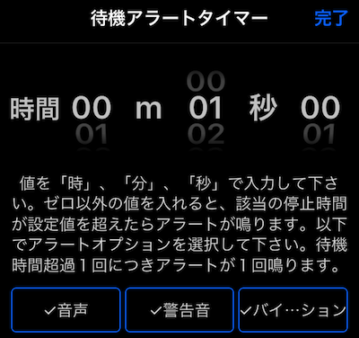 アラートのタイマーとオプションの両方を音声、ビープ音または振動として設定できます。