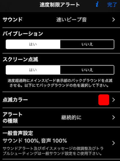 バージョン1.8.2(PRO)からは、アラート音、ビジュアル(フラッシュ)、ロジックのための非常に多くのパラメータを設定できます。 新しい速度制限アラート設定ページ(詳細設定>速度制限アラート)は次のとおりです。