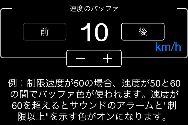 ドキュメンテーションスピードメータースピードの許容範囲スピードの許容範囲制限速度値を25km/hに設定して30km/hになった時にアラートが欲しいといったようなリクエストがよくあります。この機能が実現しました! 「詳細設定」>「スピード色&バッファー」で設定できます。mphやkm/h(およびノット)の値にパーセント値をバッファ値として追加適用してください。青色のmphまたはkm/hをタップすれば%に切り替わります。