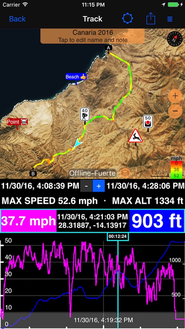 トラックを地図上で表示したり、タップ/パン/ズームして時間間隔や任意のポイントに焦点を当てるチャートをサポートして、トラックを探索します。 これは、トラック表示画面の「Map + chart」オプション(デフォルト)です。