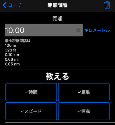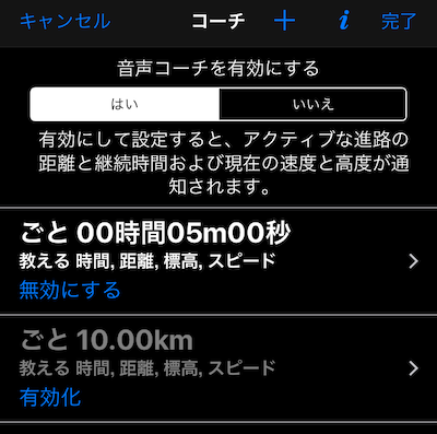 有効にして設定すると、ボイスコーチは現在の速度と高度とともに、有効なトラックの距離と継続時間を通知します。