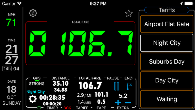 After we tapped the taximeter screen looks like this (number of decimal places for big cost digits can be changed by double tap on them or in the settings):