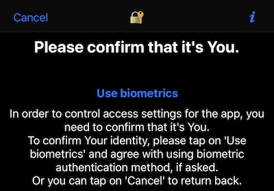 Se SIM, na abertura do aplicativo, o ID do Rosto ou o ID do Toque será automaticamente invocado -> você olha para a tela ou usa o dedo -> acesso concedido! Se você não for reconhecido, poderá usar um código PIN configurado nas configurações do aplicativo.