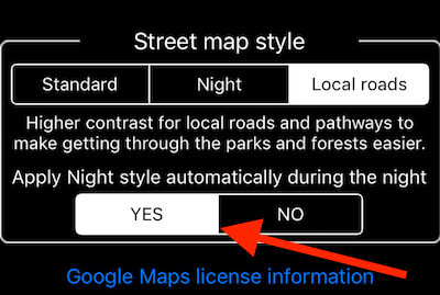 New option to apply Google night map style automatically during the night. It was a shame to have information on sunset/sunrise in the app, but not using it to force the map mode switch. By default the option is left to NO, please visit Google map settings to change your preference: