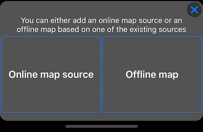 Você adiciona um novo mapa tocando no botão ‘mais’ e escolhendo entre as opções ‘Fonte do mapa on-line’ ou ‘Mapa off-line’: