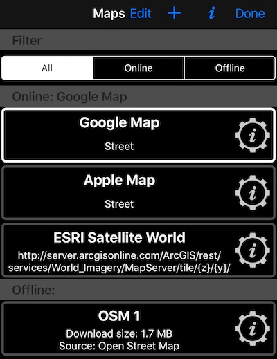 Os mapas no aplicativo são categorizados como on-line ou off-line. Os mapas incorporados do Google e da Apple pertencem à categoria On-line, bem como aos mapas de URLs personalizados que você pode adicionar por conta própria.