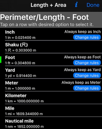 Para algumas unidades, como pés e pés quadrados, metros e metros quadrados - você pode escolher quando a exibição mudará para unidades “maiores” de milha ou milha quadrada, quilômetro ou quilômetro quadrado. Desta forma você pode ter pequenos comprimentos e áreas expressas com unidades pequenas e maiores para serem mostradas em unidades maiores. Por padrão, esta opção está definida como OFF para todas essas unidades.