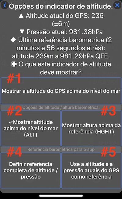 O menu indicador de altitude oferece uma opção para usar a altitude atual do GPS e a pressão do ar como referência (# 5) ou você pode usar a opção “Definir altitude completa / referência de pressão” (# 4) para configurar a correspondência arbitrária entre altitude e pressão: