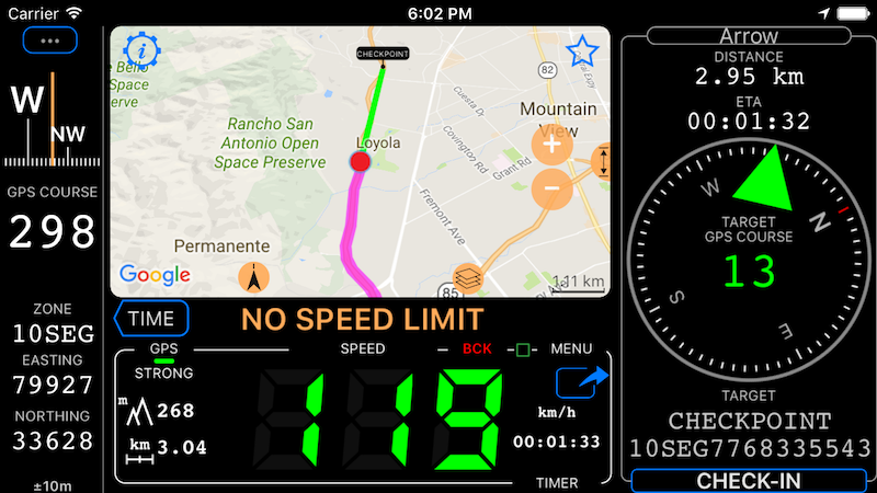 Todos os modos: Modo padrão ▪︎ Monitor de Waypoints (por exemplo, câmeras de velocidade) ▪︎ Computador de reunião ▪︎ Taxímetro ▪︎ Mapa ▪︎ Heads up (reflexão) ▪︎ Exibição de velocidade tela cheia ▪︎ Exibição do mapa em tela cheia ▪︎ Monitor de aceleração da força G ▪︎ Modo de navegação terrestre ▪︎ Alerta para tempo ocioso, sem movimento ▪︎ Esporte náutico ▪︎ Modo de parapente