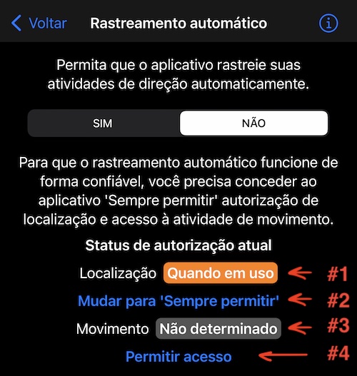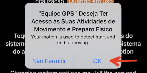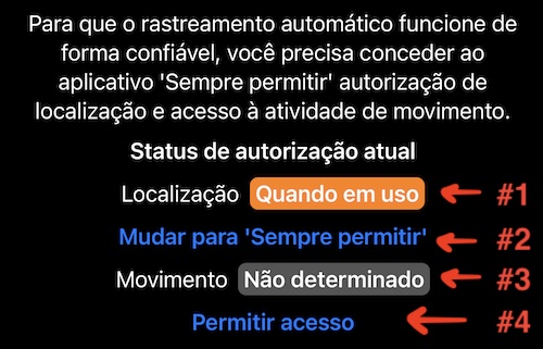 Por padrão, na primeira inicialização, o aplicativo solicita autorização de localização “Quando em uso” e é isso. Para poder iniciar e parar as faixas automaticamente, o aplicativo precisa ter acesso “Sempre permitir” ao local e também acesso ao “Movimento”.