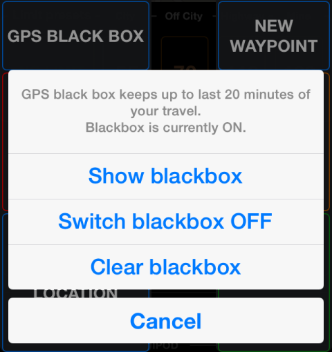 Você pode mostrar os dados da caixa preta para visualizá-los ou compartilhá-los, desativar a gravação de dados da caixa preta e limpar os dados da caixa preta atual sem desativar a gravação adicional. Como blackbox está usando a mesma função de gravação que a função de rastreamento GPS, quando você possui rastreamento ativo, o GPS blackbox não pode ser desligado ou apagado. Você precisa parar uma gravação de faixa primeiro.
