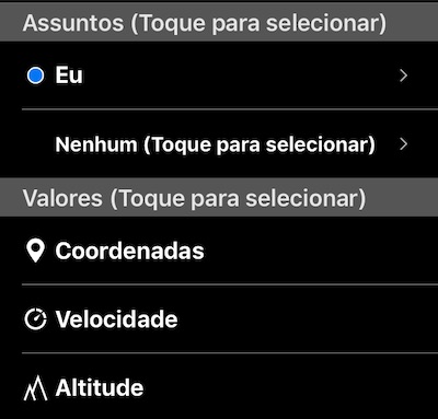 Para você, coordenadas, velocidade e altitude podem ser mostradas. Para waypoint e seta vermelha, essas são apenas coordenadas.
