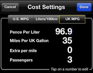 In the window that opens tap on UK MPG to select it. And enter fuel price in pence per liter, miles per galon.