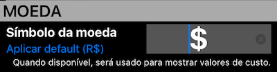 Aqui você pode configurar um símbolo de moeda para ser usado sempre que os valores relacionados ao custo são mostrados: