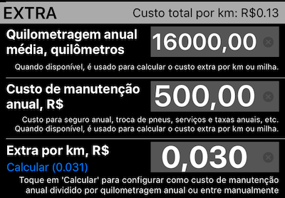 Seria ótimo se o preço por milha ou quilômetro se baseasse unicamente no preço do combustível. Mas no mundo real, também pagamos seguro, pagamos o serviço anual e trocamos pneus duas vezes por ano em territórios mais frios. Isso tudo acrescenta e muda o preço final por cada milha / quilômetro que conduzimos. Nesta seção, você pode configurar esta, parte anual da despesa para ajustar o custo total de milha ou quilômetro: