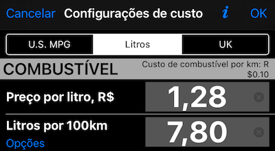 Permitam-me referir-me à seção anterior para a opção do Reino Unido “Milhas por litro”. Você pode fazer o mesmo na guia “Litros”, toque em “Opções” e escolha a opção “Quilômetros por litro” para a eficiência de combustível “Litros”.