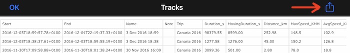 Em seguida, use o botão de ação para abrir a visualização com a lista das trajetos filtradas. A janela de visualização tem seu próprio botão de ação para fazer “qualquer coisa” com a lista, abrir no Numbers/Excel, enviar por e-mail, salvar no iCloud/Dropbox, opções ilimitadas aqui.