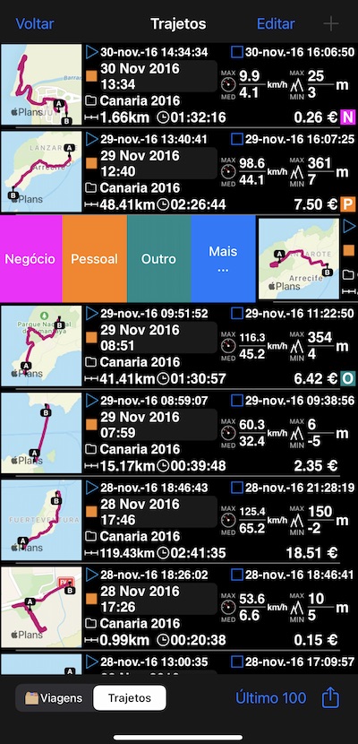 Categorias de trajeto: Negócios, Pessoal, etc.