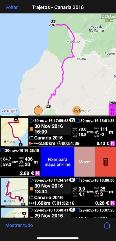 Você pode mostrar todas as trajetos desta viagem no mapa de uma só vez tocando no botão “Mostrar tudo”.