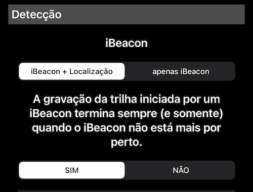 Se você tiver um, abra as configurações do aplicativo (ou Configurações avançadas no aplicativo Velocímetro 55) > Rastreamento por GPS > Rastreamento automático > role até a seção iBeacon:
