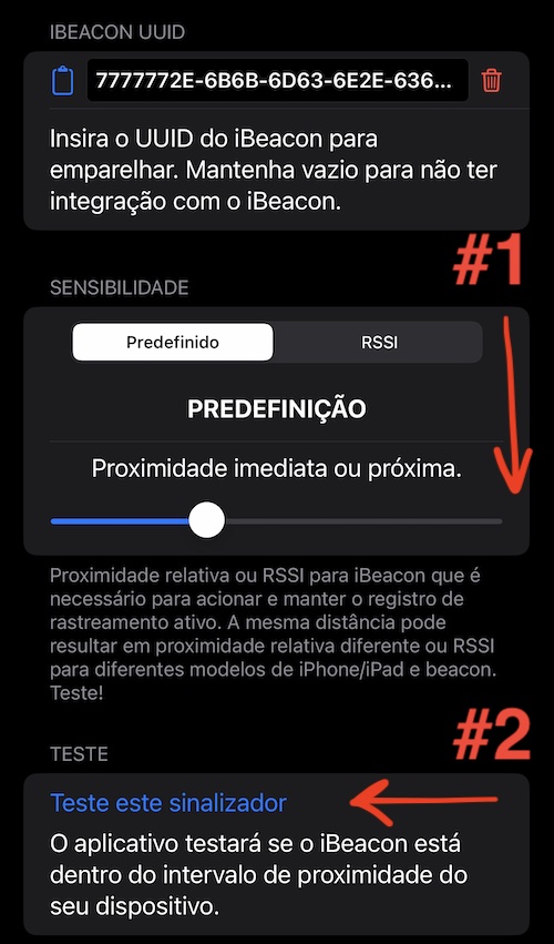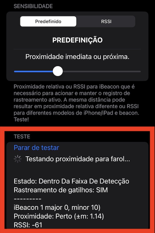 Se você tiver iBeacon muito fraco (ou escondido em algum lugar no compartimento) ou bluetooth muito fraco no iPhone (ou iPad celular), mova o controle deslizante de sensibilidade para a posição mais alta (mais à direita). Nesta posição, o rastreamento será acionado se o iPhone puder detectar iBeacon(s) com aquele UUID. A proximidade do(s) farol(es) não é examinada.
