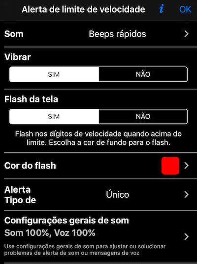 Você também pode configurar a opção de vibração e o flash da tela para o excesso de velocidade aqui.