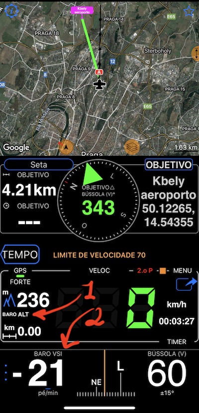 O ecrã de parapente inclui o mapa, a seta para o alvo, as velocidades horizontal e vertical, as opções de altitude ou altura barométrica (QFE e QNH), bússola. Aqui está a aparência: