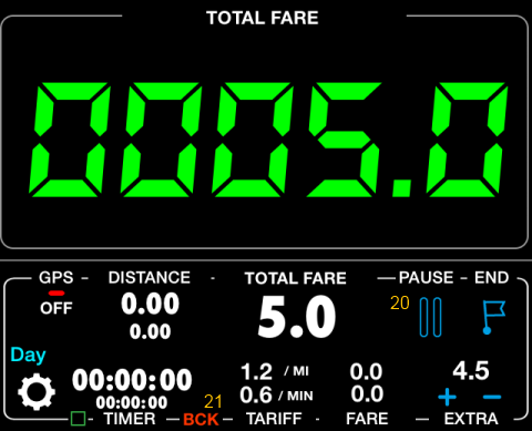 A tarifa mínima foi aplicada, foi 5.0, portanto, o taxímetro mostra 5.0. No campo extra mostra 4.5. Lembre-se de configurar 3.5 como uma taxa de entrada para esta tarifa e também aplicamos 1.0 para uma bagagem, então dá 4.5 para extras agora. Também podemos ver o novo botão # 20 que faz uma pausa na viagem e as cobranças. O plano de trabalho de fundo # 21 mostra que o aplicativo funciona em segundo plano, então o tempo, a distância e as cobranças serão executadas, mesmo que a tela do dispositivo esteja bloqueada, a chamada esteja em andamento ou você use outras aplicações enquanto isso (como a navegação, por exemplo). Primeira vez que você começar um taxímetro, ele irá oferecer-lhe para trabalhar em segundo plano automaticamente, nós recomendamos que você diga “OK”.