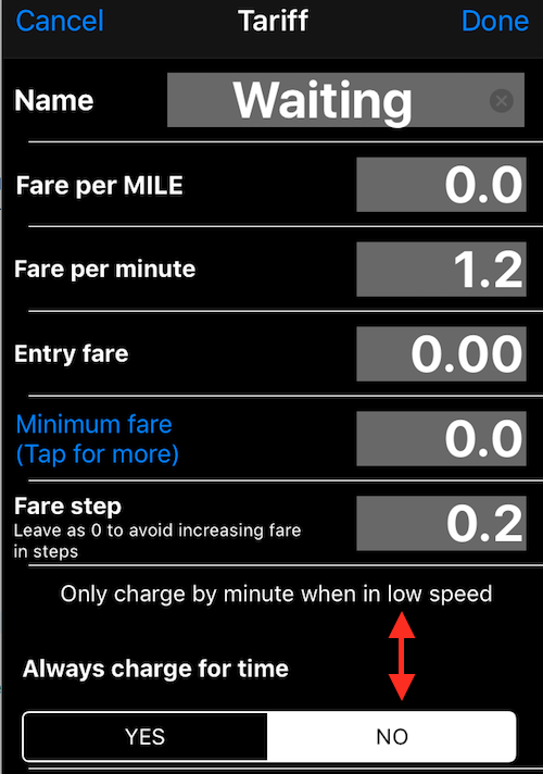Certifique-se de configurar essa “velocidade inferior a” para ser superior a 0! Se o valor for deixado em zero, o taxímetro não será cobrado pelo tempo. No exemplo abaixo, é definido como 5 mph. Quando a velocidade for inferior a 5 mph, o taxímetro começará a cobrar pelo tempo.