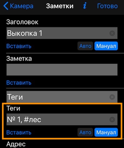 После съёмки фото, вернуться к редактированию тегов можно через МЕНЮ > МЕТКИ и нажав прямо на фото на рядке метки. Или через нижнюю правую кнопку для показа списка меток.
