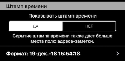 Возможность скрыть поле штампа времени и тем самым дать больше места полю адреса-заметки. Настройки > Настройки съёмки > Штамп времени: