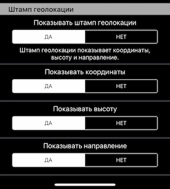 В дополнение к возможности полностью скрыть всю верхнюю строку с гео позицией, теперь Вы можете скрыть отдельно поля координат, высоты или направления. Настройки > Настройки съёмки >