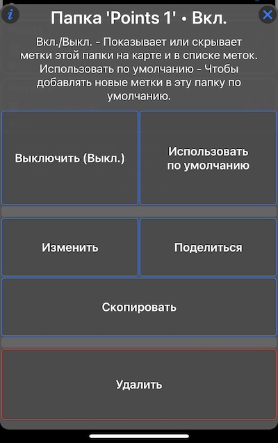 - **Отключить / включить (**ВЫКЛ.****/ВКЛ.) - переключает отображение точек сбора на карте и в списке точек.