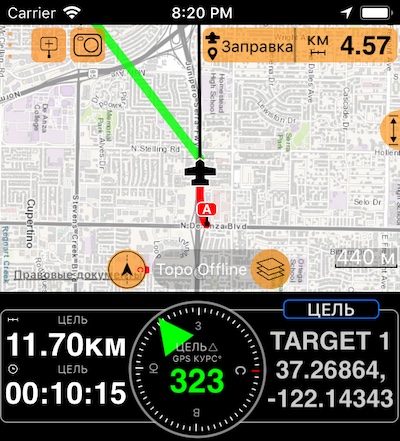 Правый угол показывает расстояние между актуальным положением и выбранной меткой, отличной ор цели. Таким образом, можно следовать к цели (TARGET 1) и при этом всегда иметь под рукой расстояние до заправки (метка Заправка).
