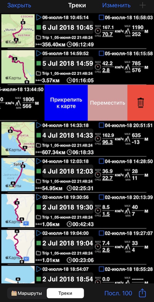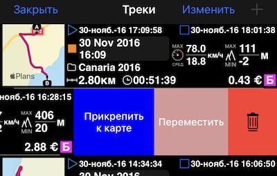 Проведите справа налево, чтобы переместить трек в другую поездку или прикрепить/закрепить его на основной карте.