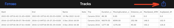 При сохранении файла выберите «Архив маршрута» и сохраните его в iCloud или Dropbox. Затем на любом iPhone или iPad вы можете открыть этот архив маршрута (с расширением .trk) в приложении. Поездка со всеми ее треками будет импортирована так же, как и на оригинальном iPhone/iPad.