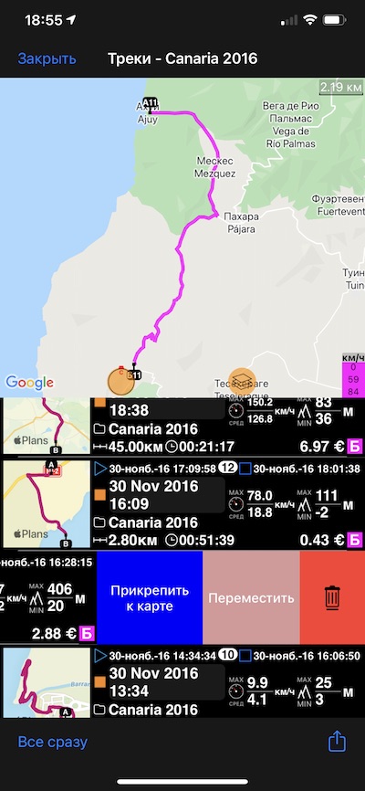Вы можете показать все треки этой поездки на карте сразу, нажав на кнопку «Все сразу».
