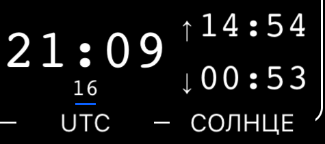 ДокументацияКомпас 55Опция для показа времени UTC.По требованию пилотов.Нажмите над меткой “ЧАСЫ”:Текущее время, так же, как и время восхода и захода солнца будет показываться в UTC (Universal Time Coordinates, Greenwich mean time - GMT).