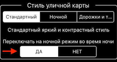 Эппл карта тоже поддерживает ночной режим, но Эппл не предоставляет контроля над включением этого режима и решает сам когда карта в него переходит.