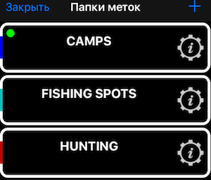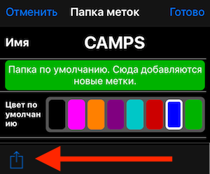 Для экспорта меток нажмите на МЕНЮ и затем “ПАПКИ МЕТОК”, откроется список папок: