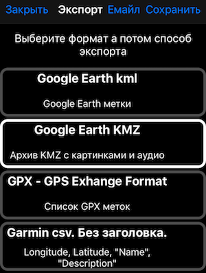 Экспорт меток в форматах GPX и Google Earth KML/KMZ.