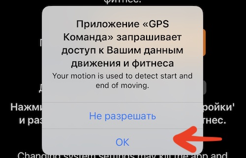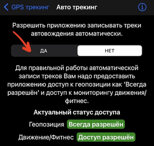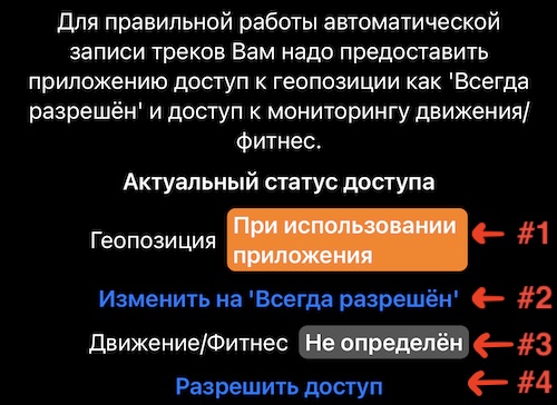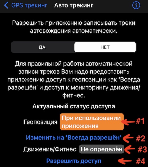 По умолчанию при первом запуске приложение запрашивает авторизацию местоположения «При использовании», и это все. Чтобы иметь возможность запускать и останавливать треки автоматически, приложению необходимо иметь доступ «Всегда разрешен» к местоположению, а также доступ к «Движению и фитнес активности».